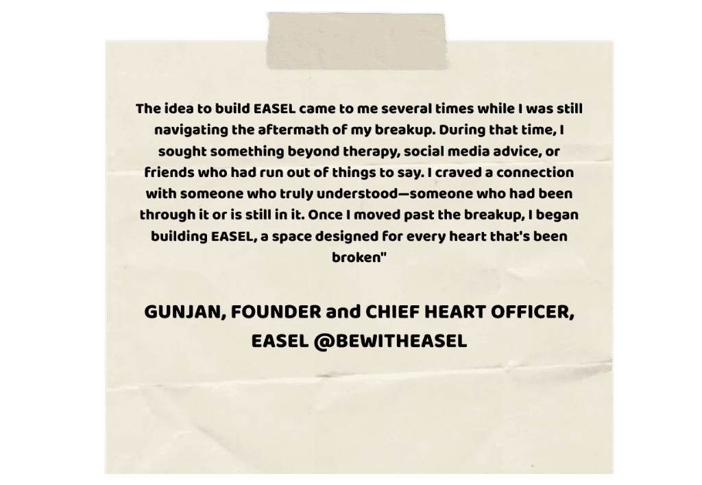 At EASEL, we've created a supportive, peer-led space for those dealing with heartbreak. It's a place where you can connect with others who truly understand, free from gatekeeping or toxic positivity. Here, you're seen and heard as you find your own path to healing.
